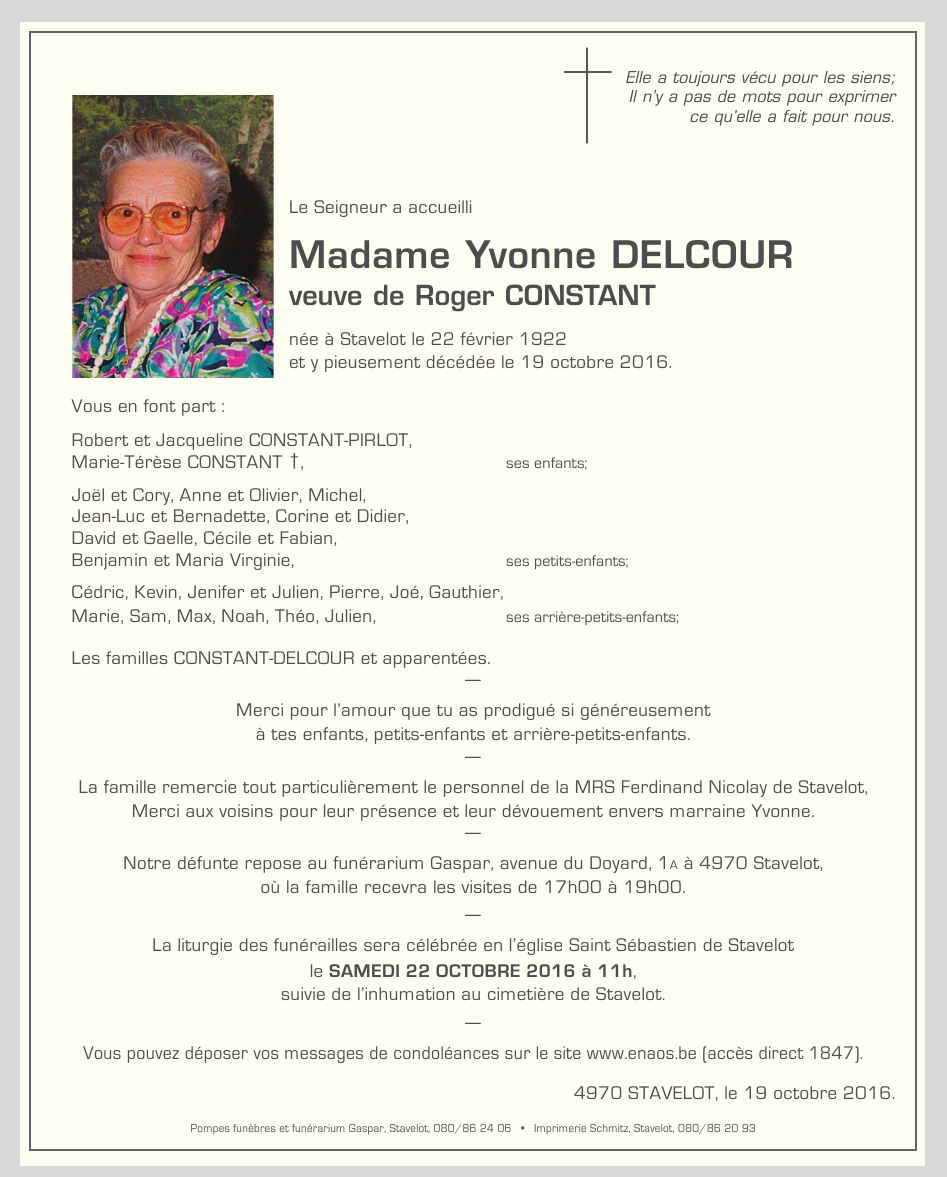 Décédée à Stavelot (4970) le jeudi 20 octobre 2016 à l'âge de 94 ans