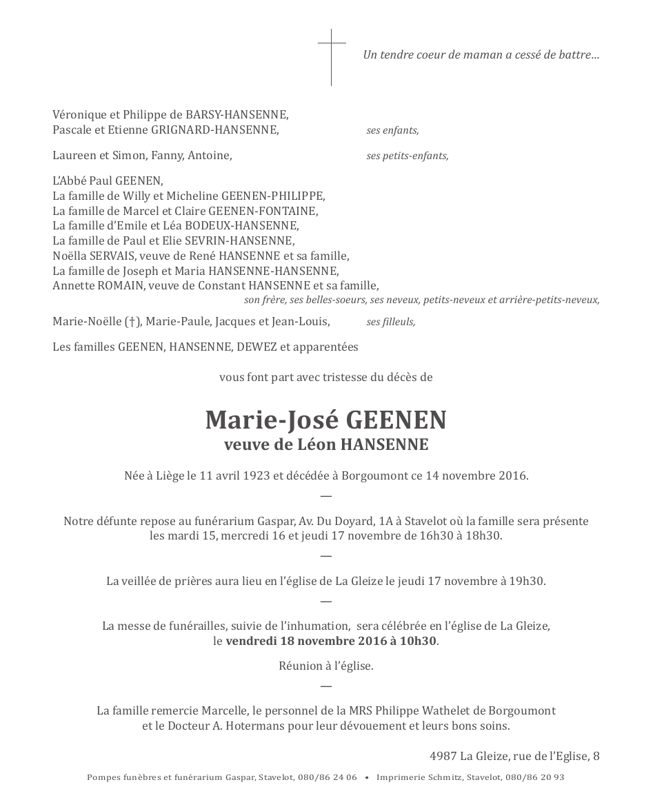 Décédée à Borgoumont (4987) le lundi 14 novembre 2016 à l'âge de 93 ans