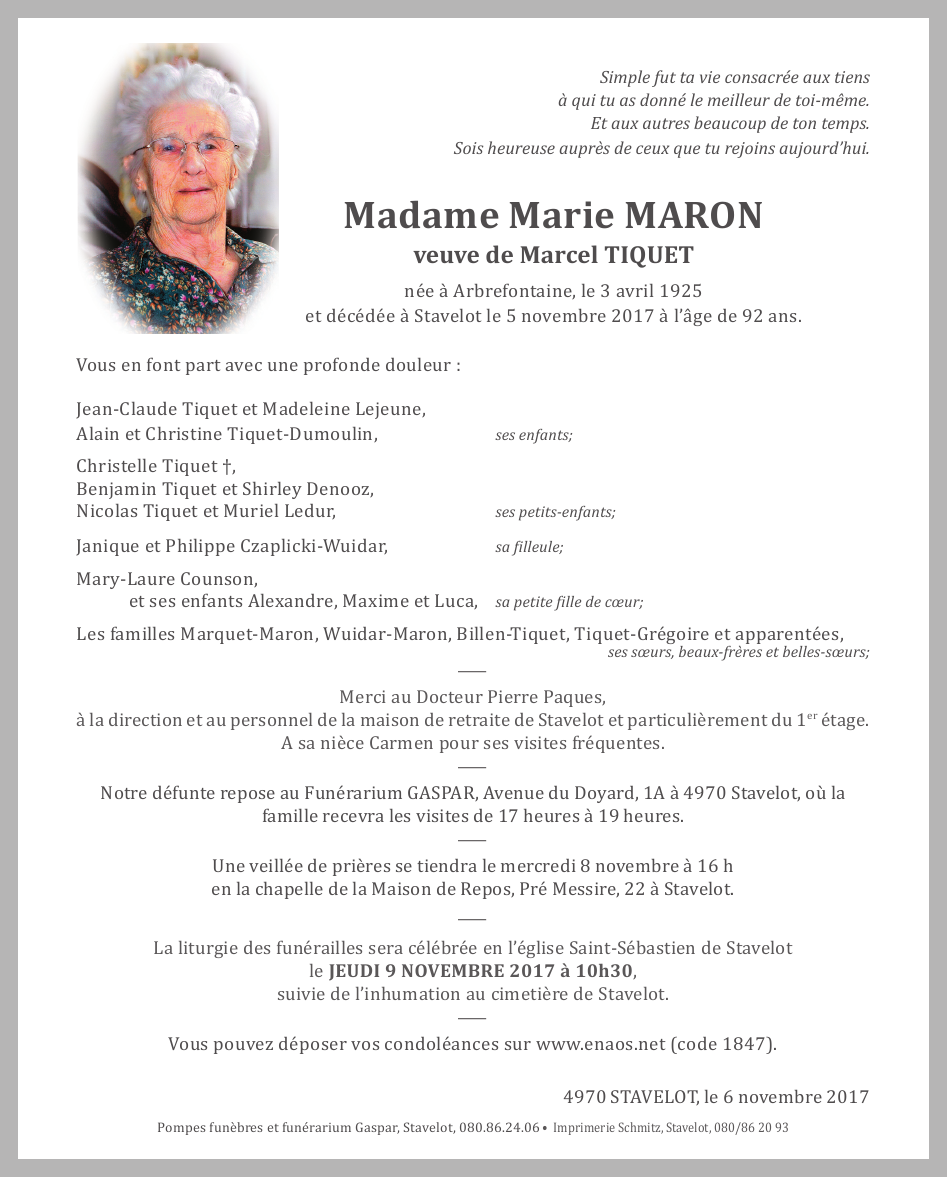 Décédée à Stavelot (4970) le dimanche 5 novembre 2017 à l'âge de 92 ans
