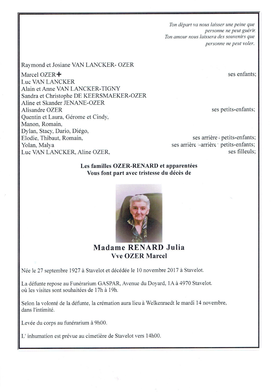 Décédée à Stavelot (4970) le vendredi 10 novembre 2017 à l'âge de 90 ans