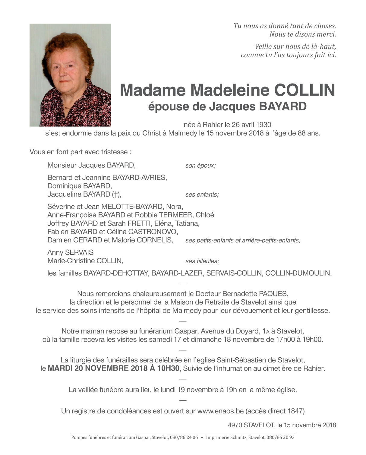 Décédée à Malmedy (4960) le jeudi 15 novembre 2018 à l'âge de 88 ans