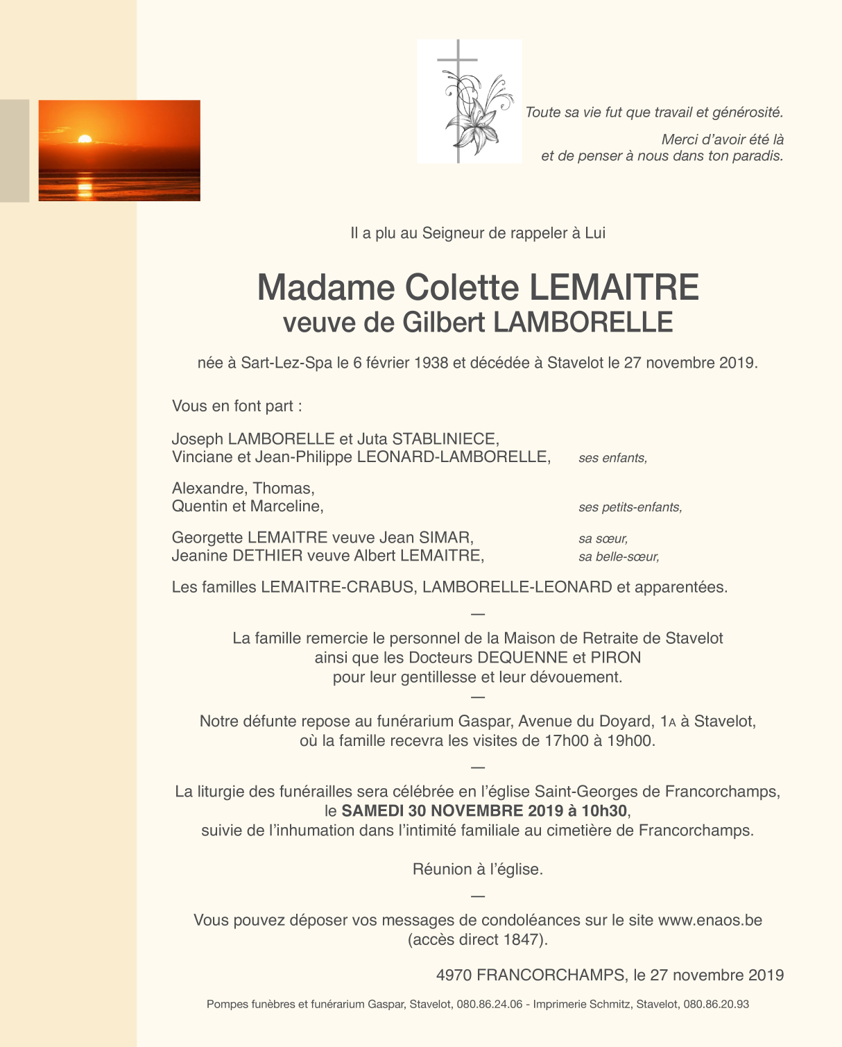 Décédée à Stavelot (4970) le mercredi 27 novembre 2019 à l'âge de 81 ans