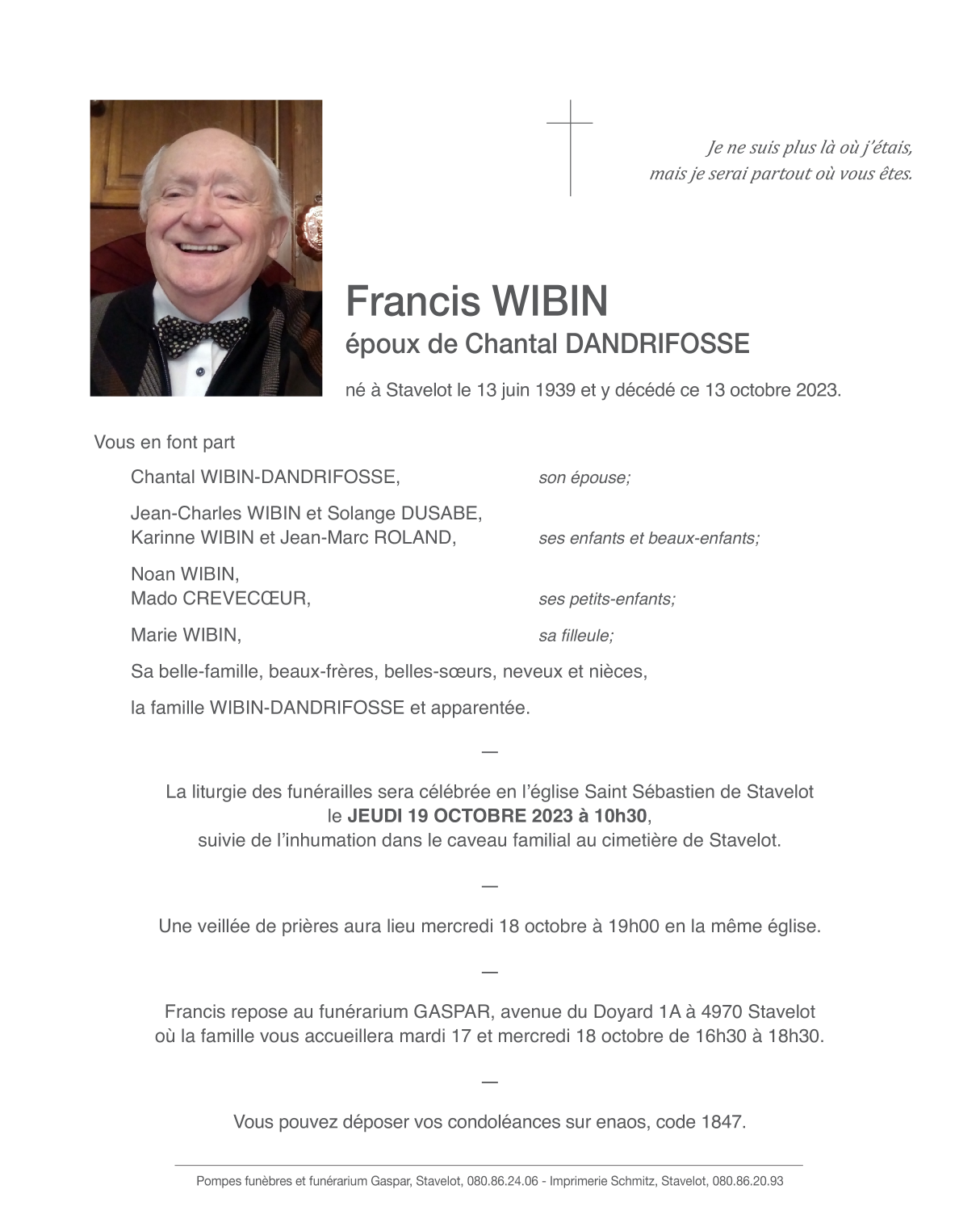 Décédé à Stavelot (4970) le vendredi 13 octobre 2023 à l'âge de 84 ans