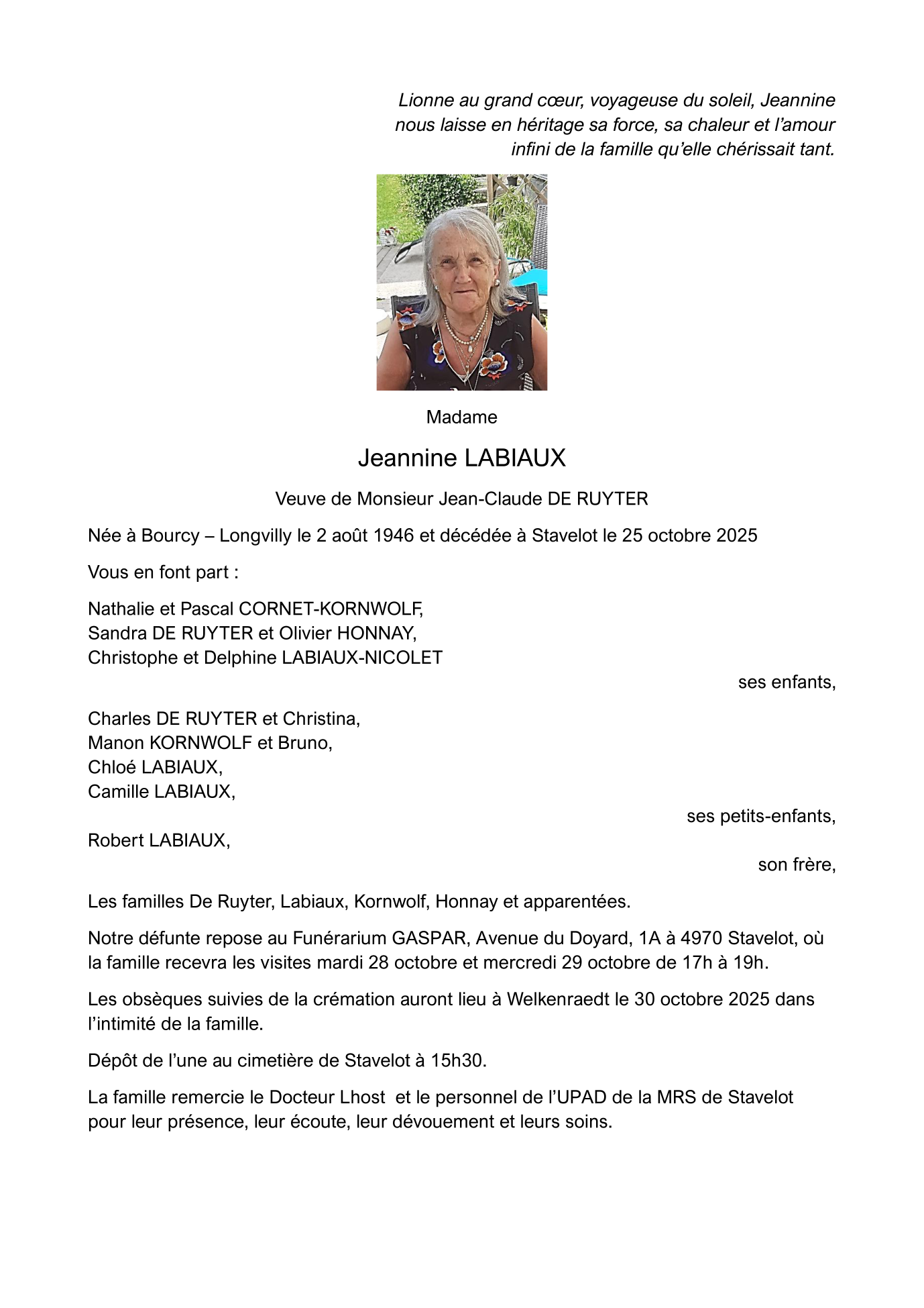 Décédée à Stavelot (4970) le samedi 25 octobre 2025 à l'âge de 79 ans