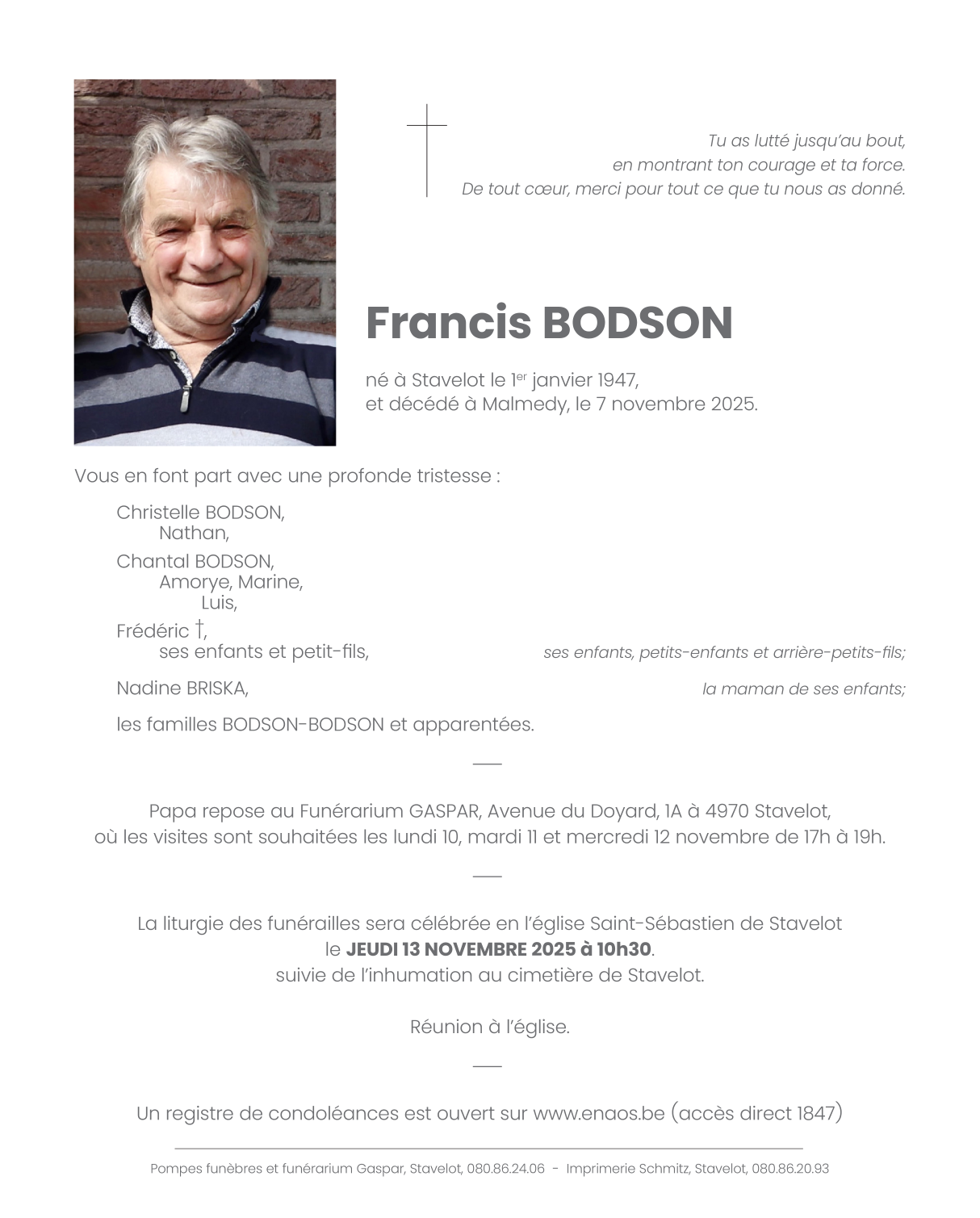 Décédé à Malmedy (4960) le vendredi 7 novembre 2025 à l'âge de 78 ans