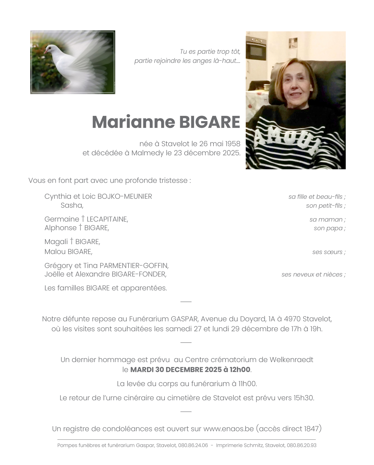 Décédée à Malmedy (4960) le mardi 23 décembre 2025 à l'âge de 67 ans