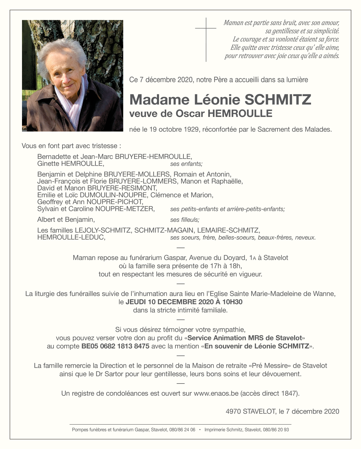 Décédée à Stavelot (4970) le lundi 7 décembre 2020 à l'âge de 91 ans