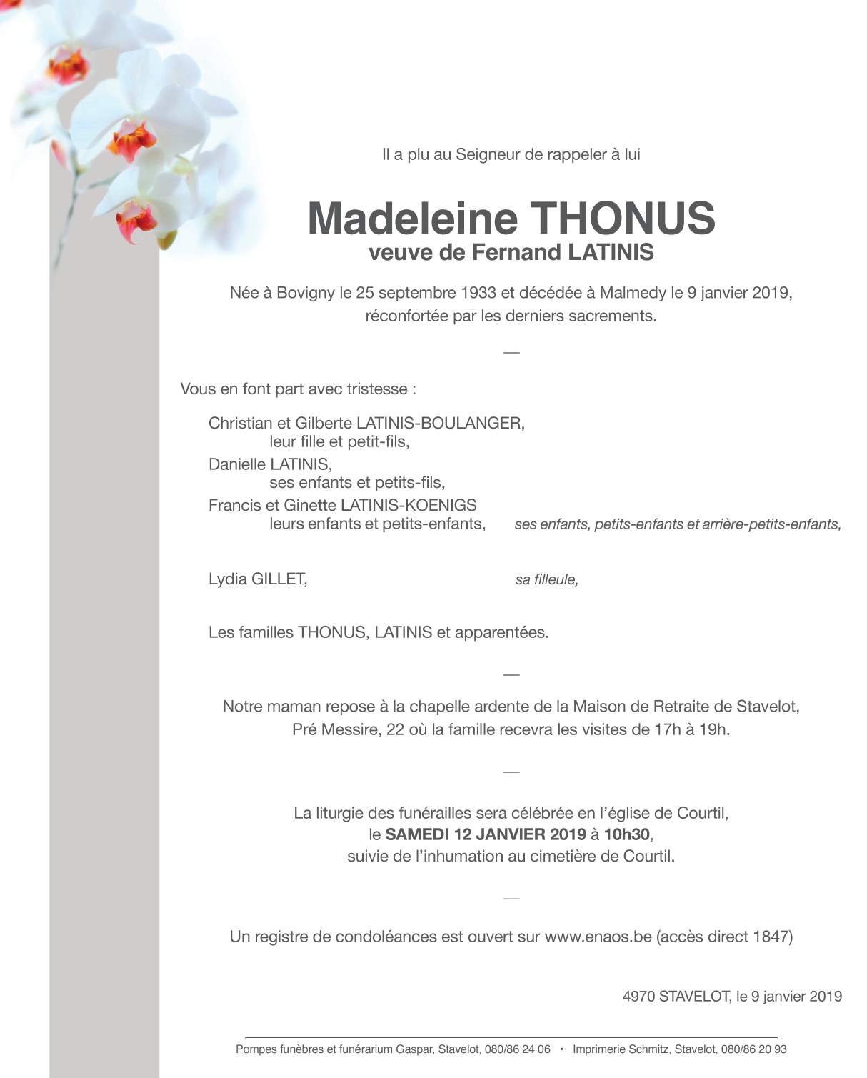Décédée à Malmedy (4960) le mercredi 9 janvier 2019 à l'âge de 85 ans