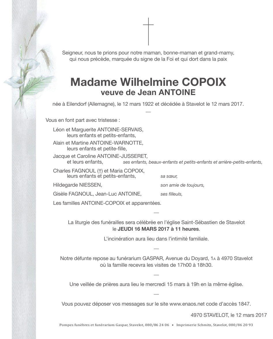 Décédée à Stavelot (4970) le dimanche 12 mars 2017 à l'âge de 95 ans