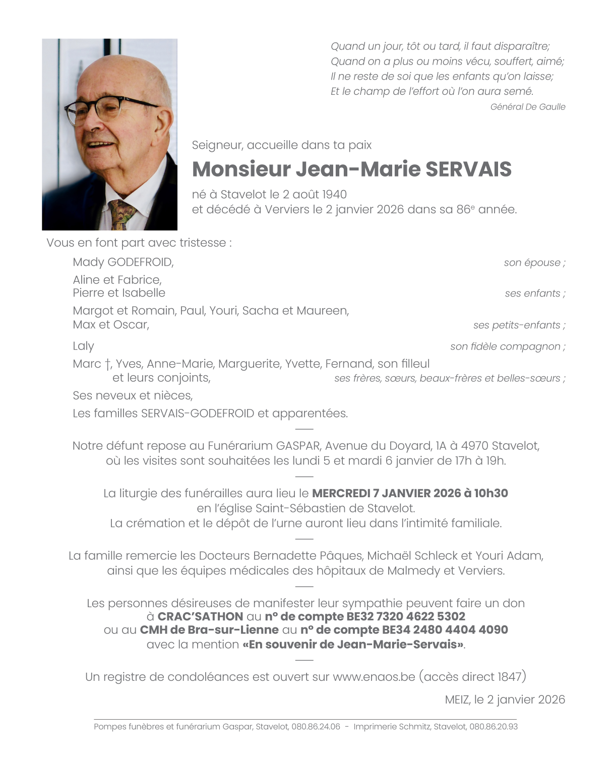 Décédé à Verviers (4800) le vendredi 2 janvier 2026 à l'âge de 85 ans