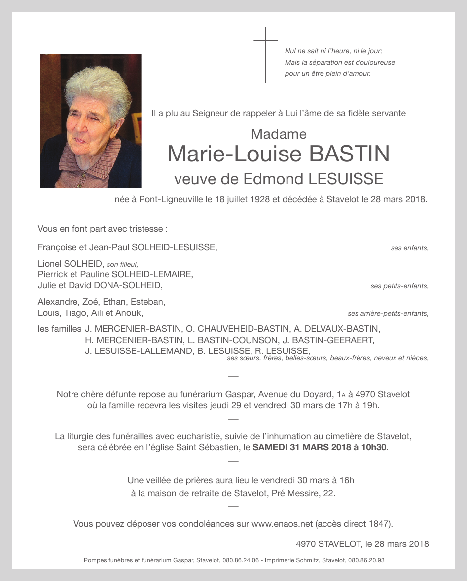 Décédée à Stavelot (4970) le mercredi 28 mars 2018 à l'âge de 89 ans
