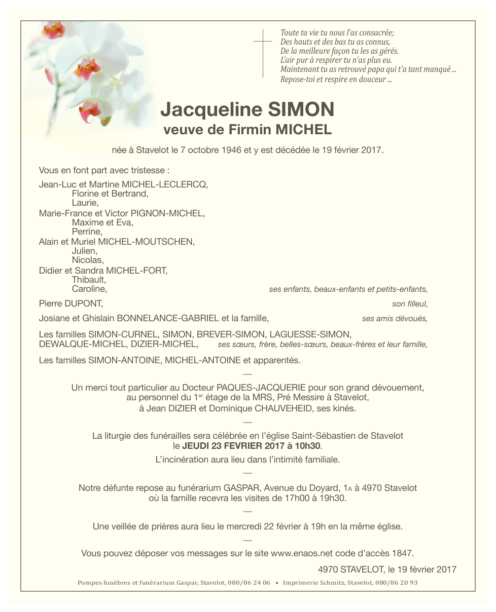 Décédée à Stavelot (4970) le dimanche 19 février 2017 à l'âge de 70 ans