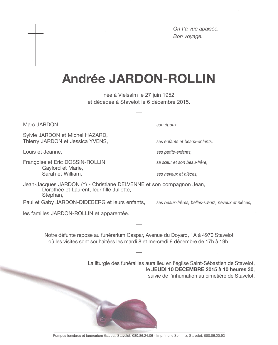 Décédée à Stavelot (4970) le dimanche 6 décembre 2015 à l'âge de 63 ans