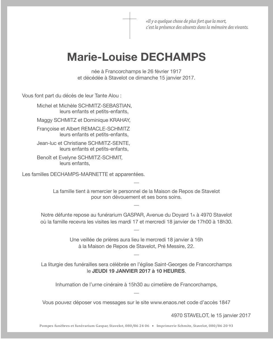 Décédée à Stavelot (4970) le dimanche 15 janvier 2017 à l'âge de 99 ans