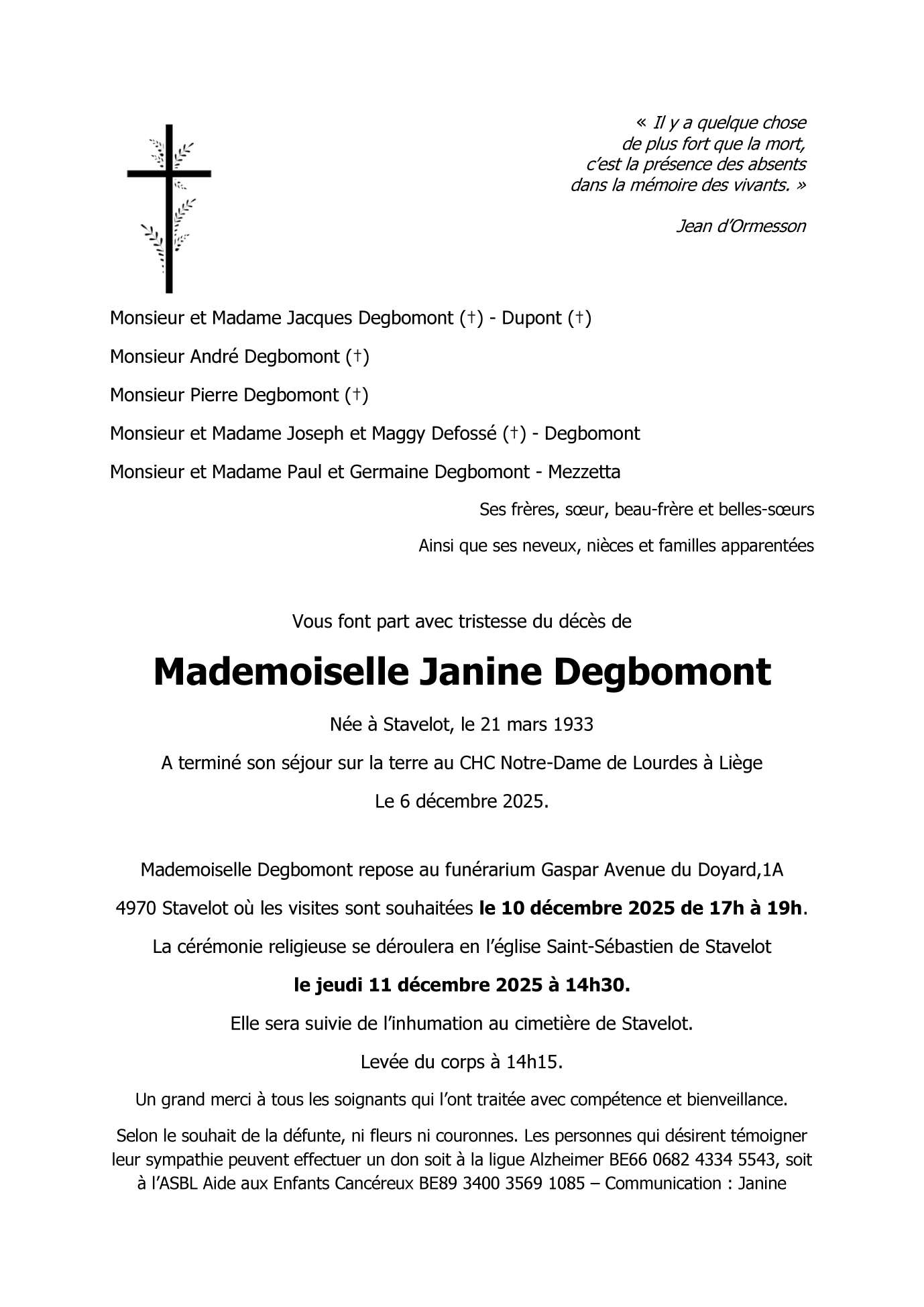 Décédée à Liège (4000) le samedi 6 décembre 2025 à l'âge de 92 ans