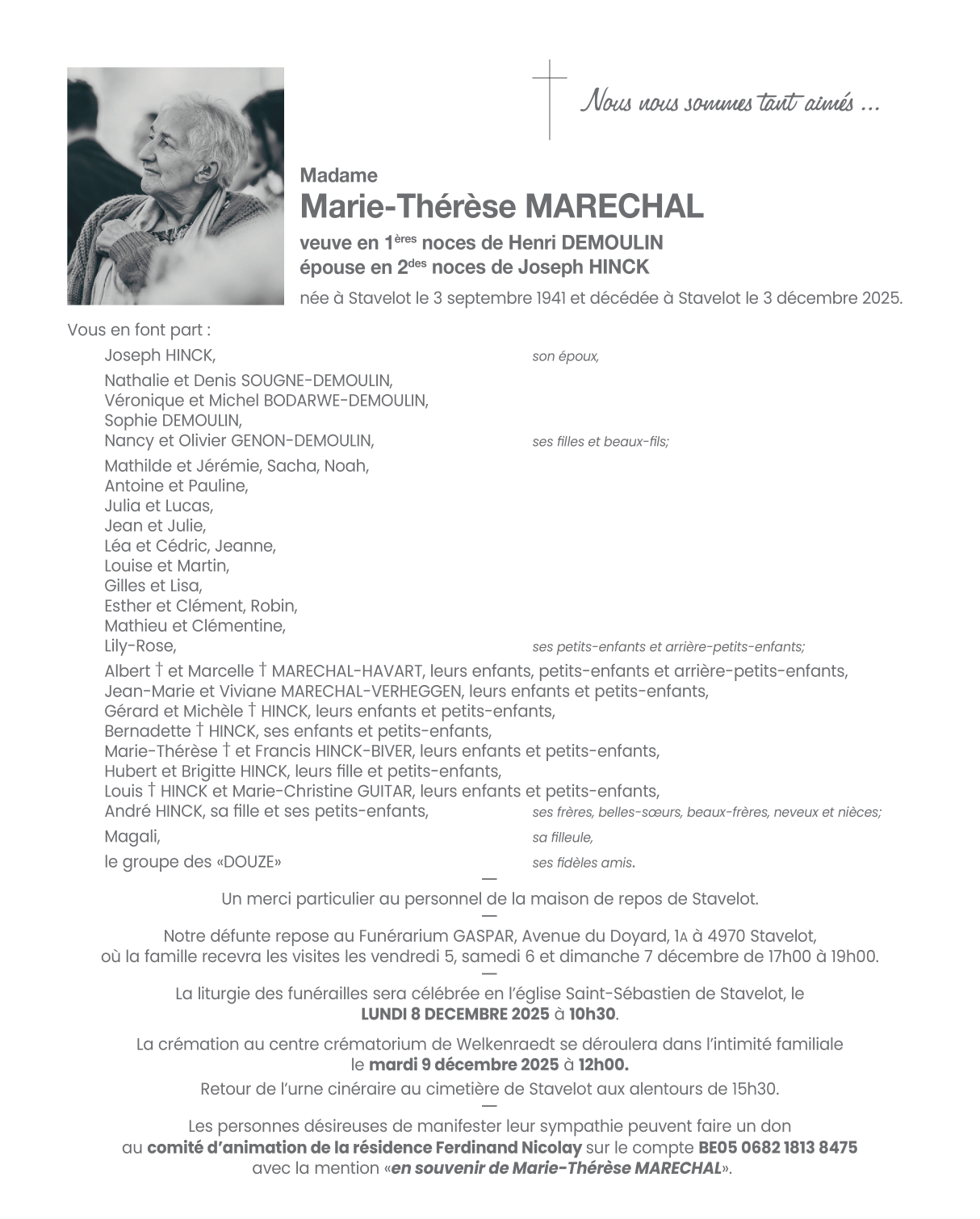 Décédée à Stavelot (4970) le mercredi 3 décembre 2025 à l'âge de 84 ans