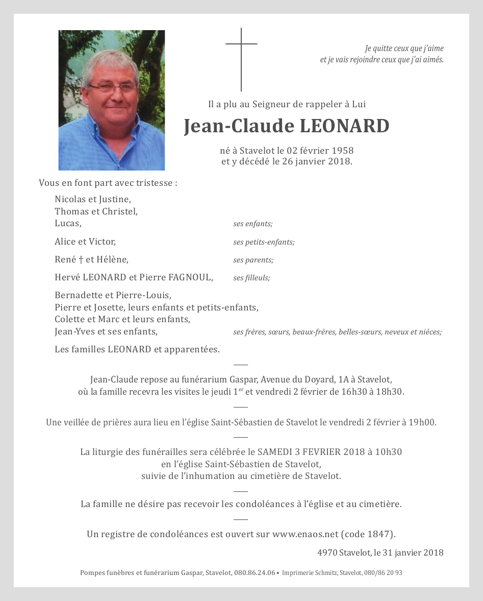 Décédé à Stavelot (4970) le vendredi 26 janvier 2018 à l'âge de 59 ans