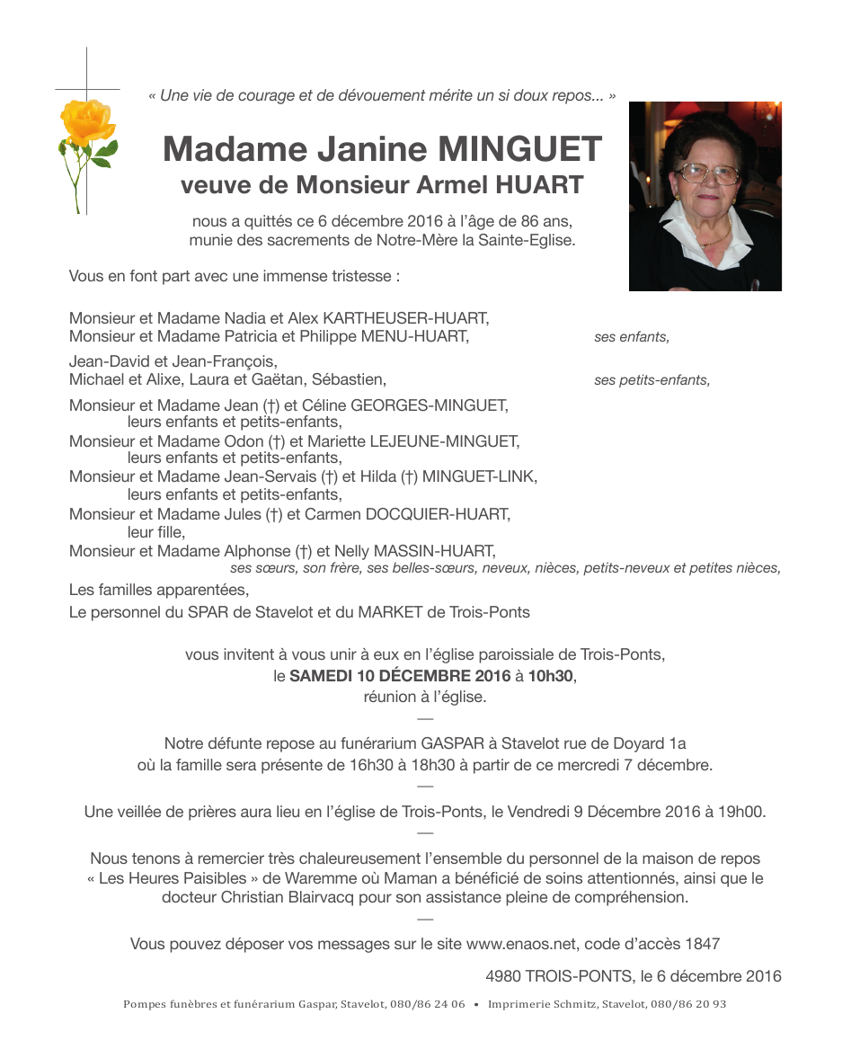 Décédée à Waremme (4300) le mardi 6 décembre 2016 à l'âge de 86 ans