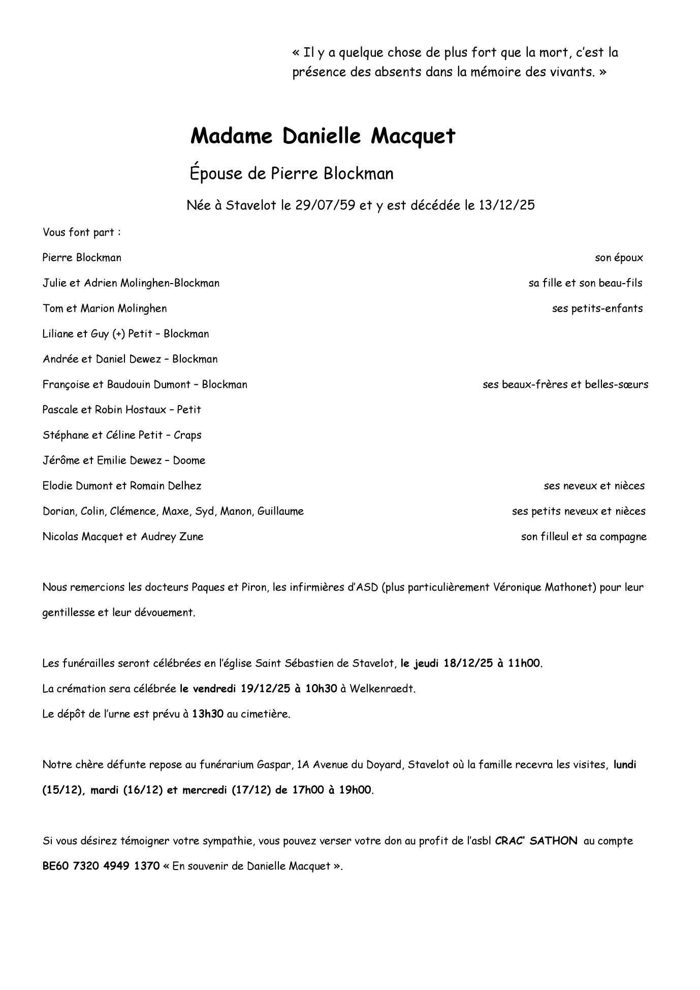 Décédée à Stavelot (4970) le samedi 13 décembre 2025 à l'âge de 66 ans