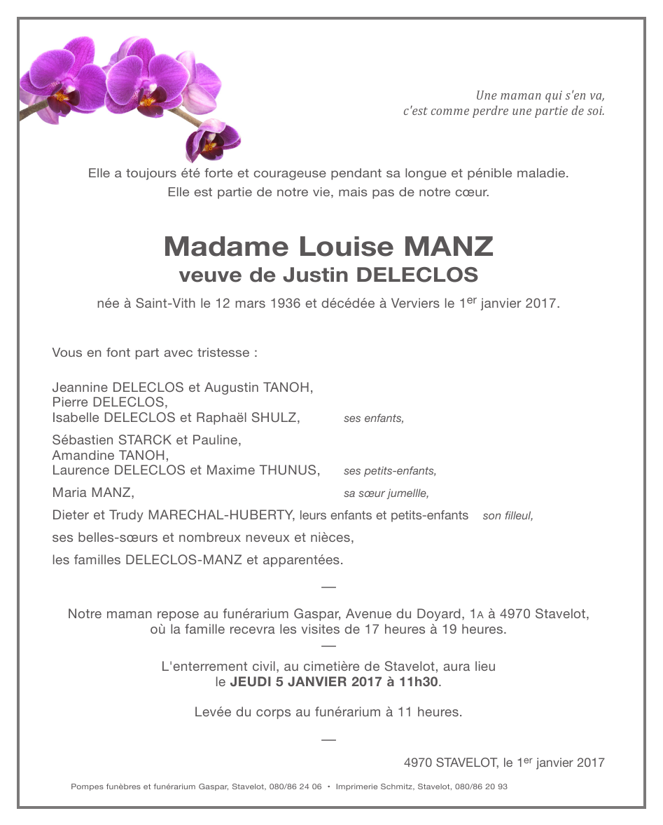 Décédée à Verviers (4800) le dimanche 1 janvier 2017 à l'âge de 80 ans