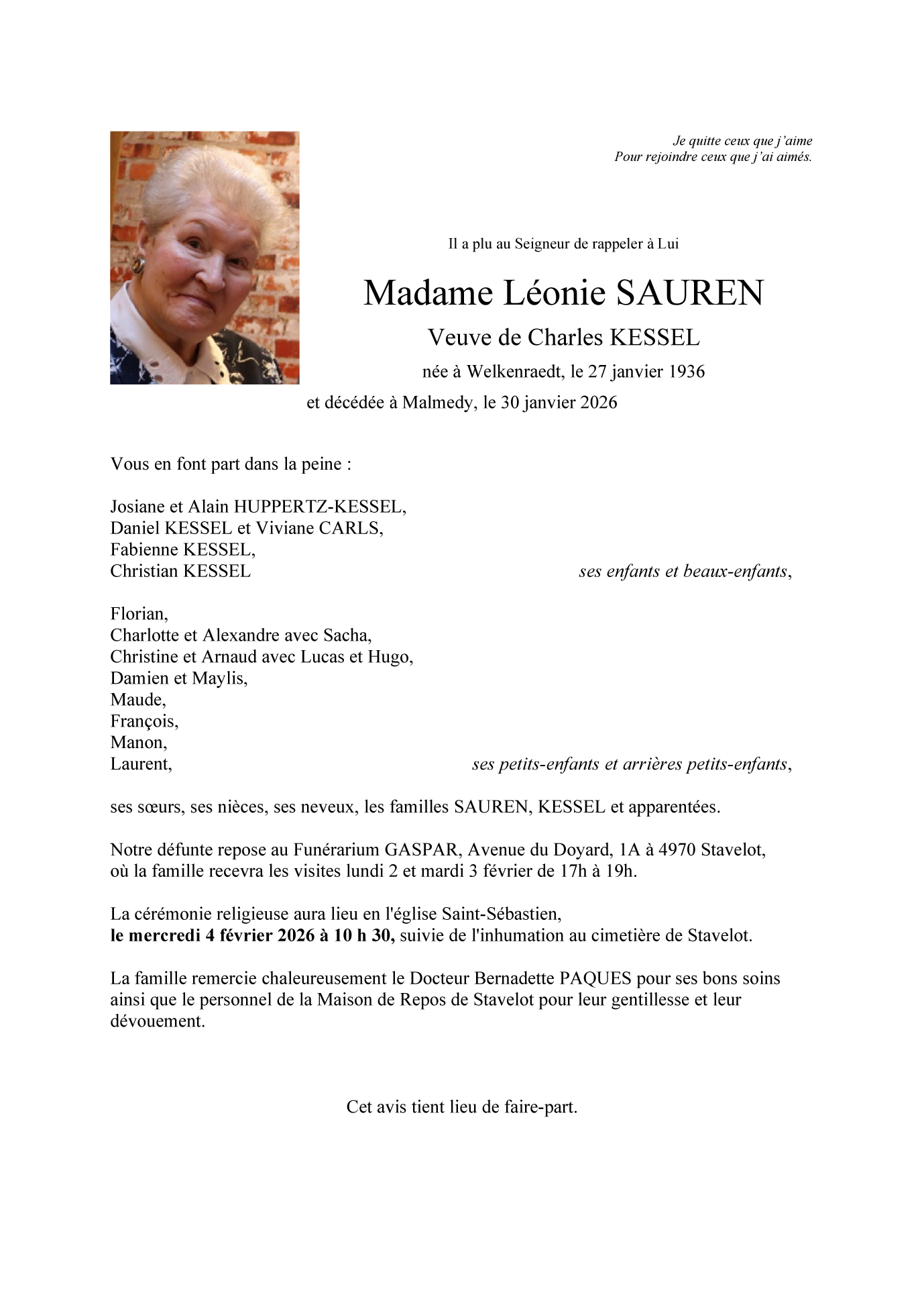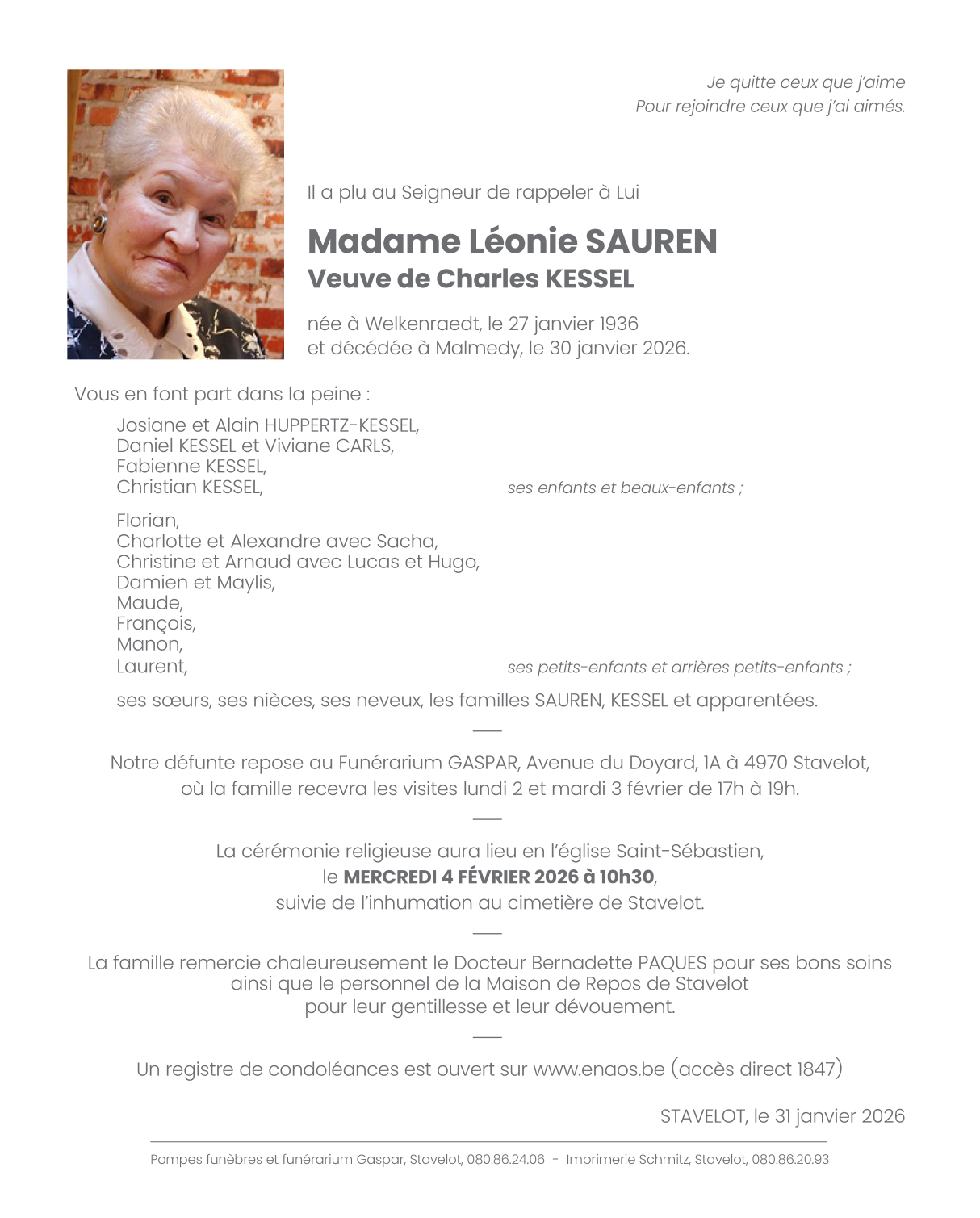 Décédée à Malmedy (4960) le vendredi 30 janvier 2026 à l'âge de 90 ans